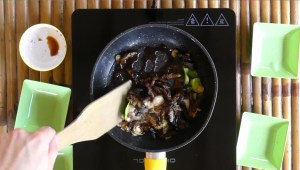 - Dans une poĂȘle, mĂ©langer tous les ingrĂ©dients sauf la ciboulette et le piment, lancer le feu et tout faire revenir ensemble jusqu’Ă ce que la sauce caramĂ©lise ;
