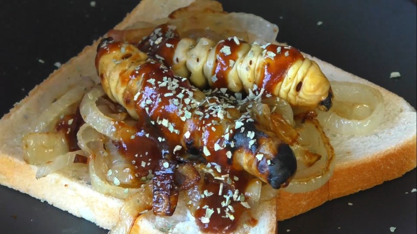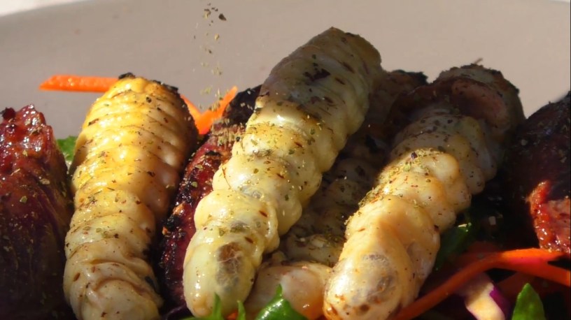 Après un élevage de grillons à peu près végétariens et un autre de fourmis définitivement insectivores, nous avons visité un élevage d’une autre espèce qui, elle, mange quelque chose qu’on ne pourrait pas manger à sa place : le charançon dont les larves sont appelées vers de palme et dévorent du bois.