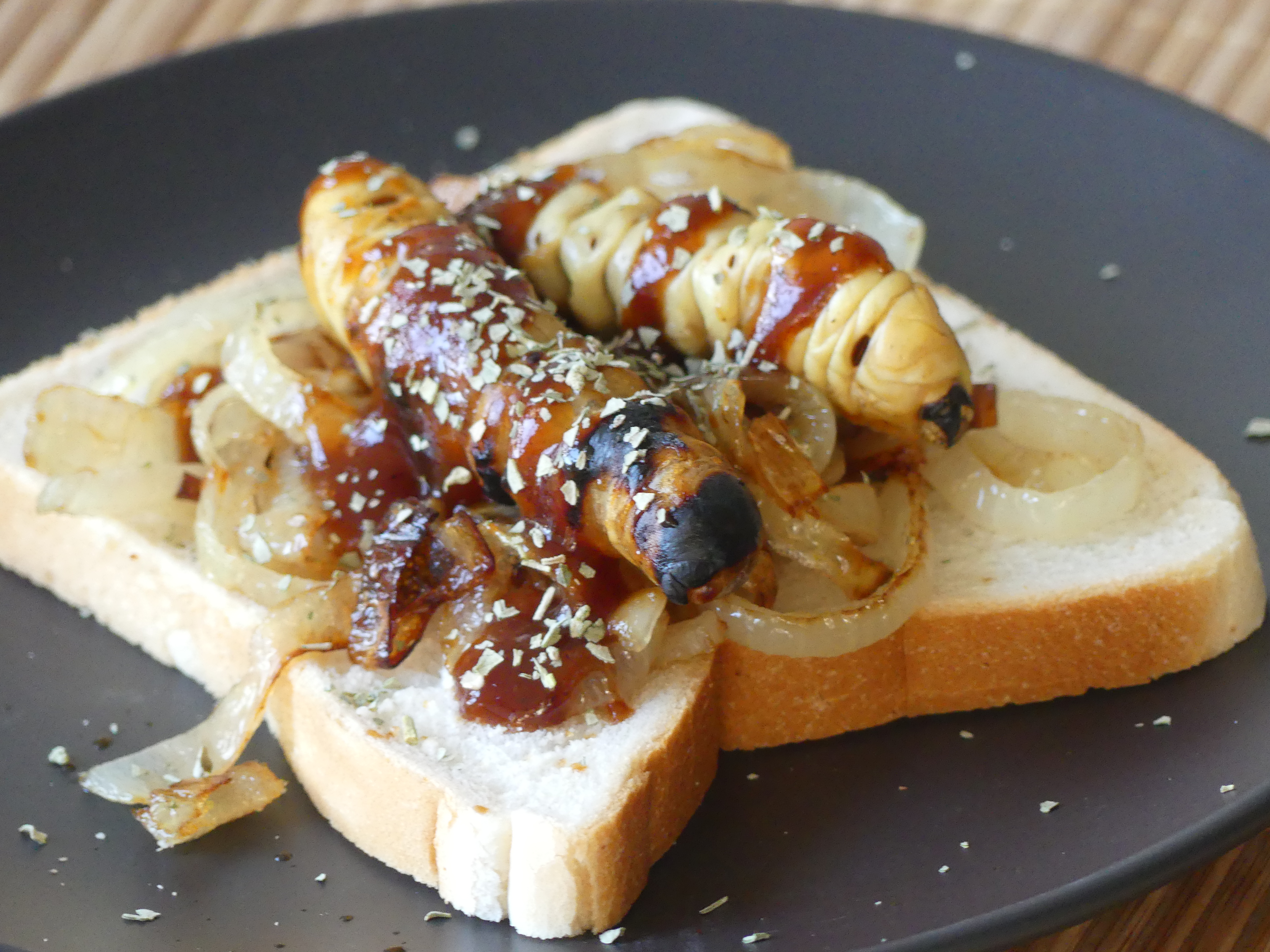 Larves de witchetty aux oignons sur un toast, Mudgee, Australie