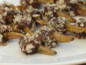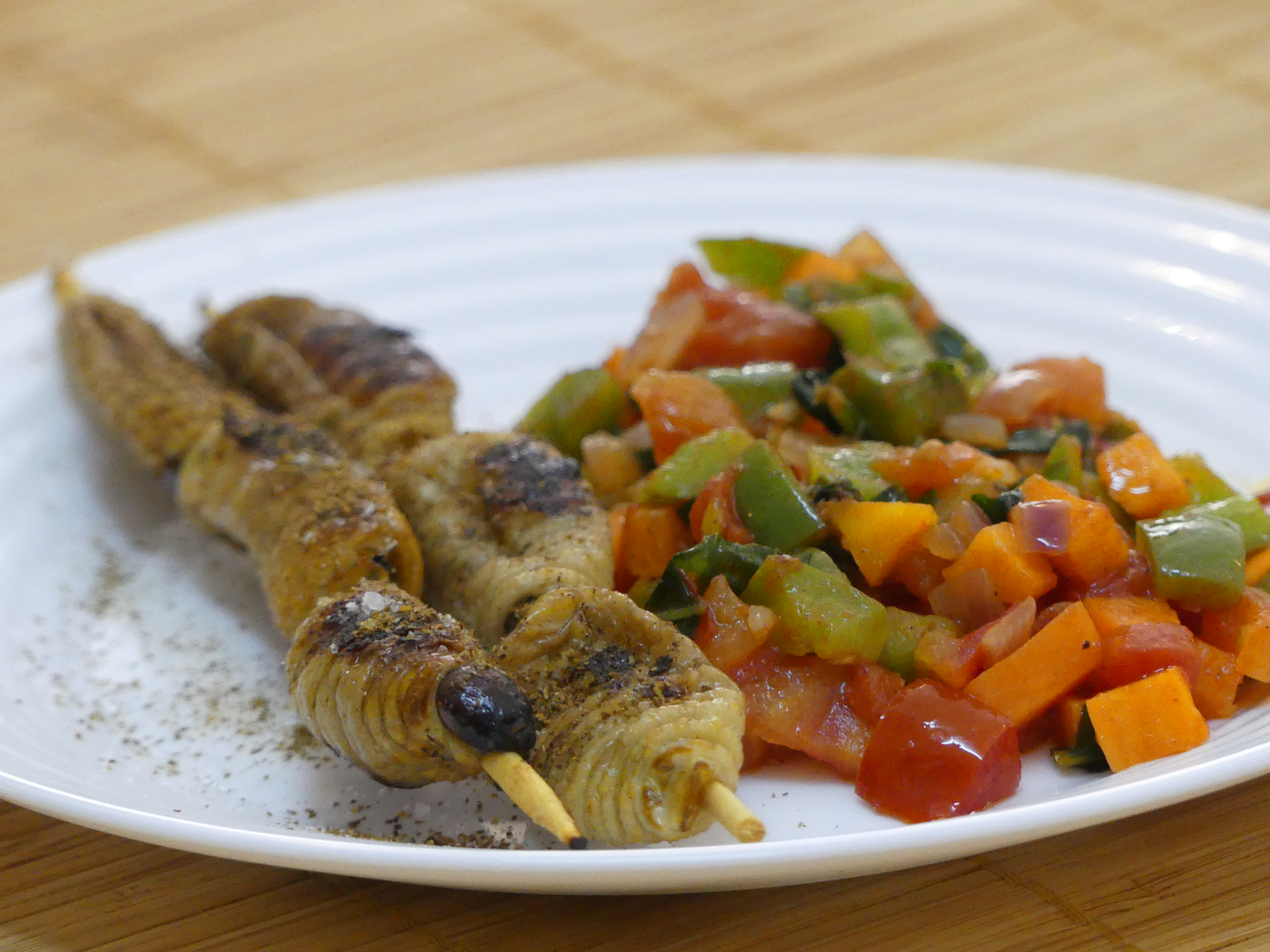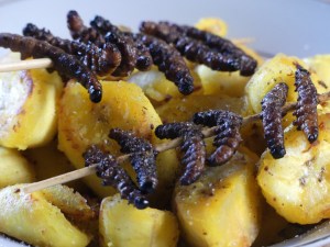 Brochettes de chenilles avec bananes plantain, Yaoundé, Cameroun