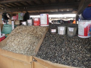 Chenilles mopane séchées et anchois séchés, marché Mbare, Harare, Zimbabwe
